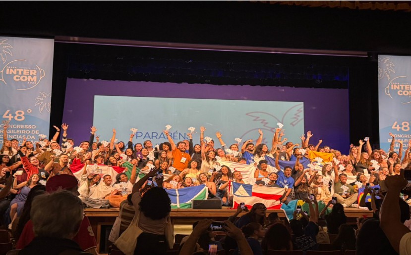 Participantes do Intercom 2025, reunidos em palco do evento. Foto: Claudia Bredarioli.